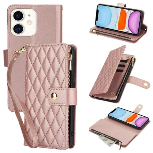 Funda de Cuero Ym016 para iPhone 11 con Billetera, Tarjeta, Cremallera Rómbica y Cordón (Oro Rosa)