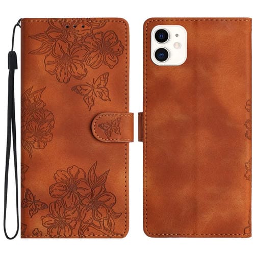 Funda para teléfono iPhone 11 PU con sensación piel mariposa y flor de cerezo en relieve (Marrón)