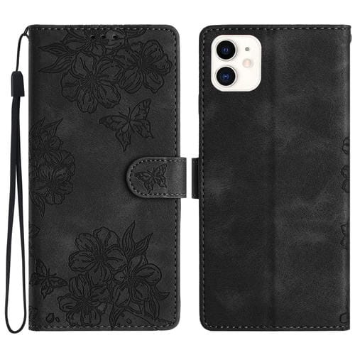 Funda para iPhone 11 con Relieve de Piel de Mariposa y Diseño de Flor de Cerezo (Negra)
