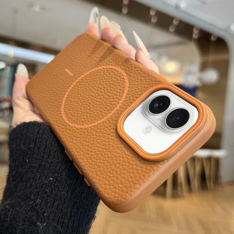 Funda TPU iPhone 16 Plus Diseño Grano de Lichi Anillo Magsafe (Marrón)