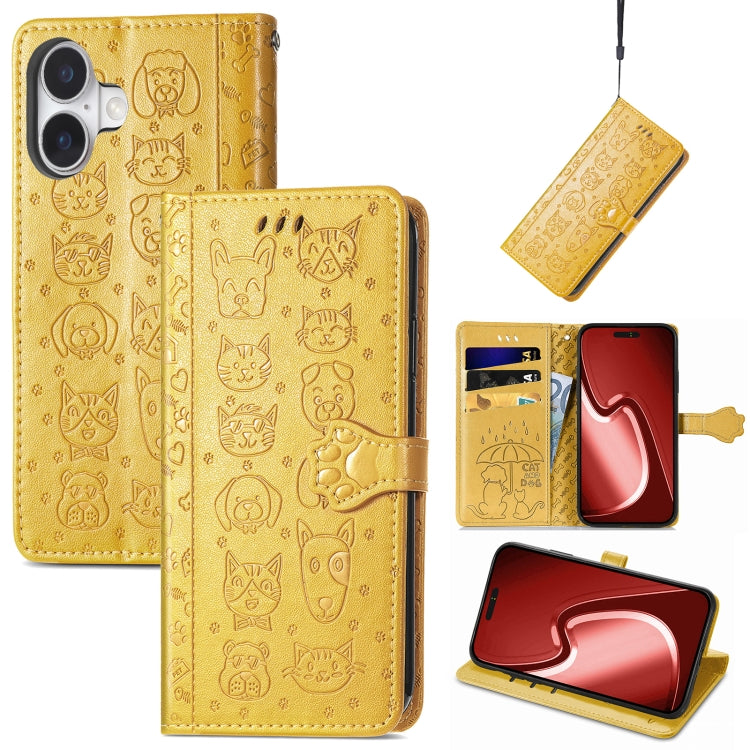 Funda de Piel para iPhone 16 Plus con Relieve de Gato y Perro (Amarilla)