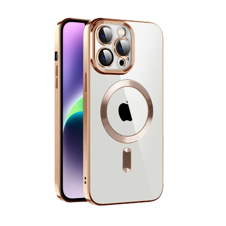 Funda para Teléfono iPhone 14 TPU Textura Plating Magsafe con Película de Lente (Rosa)