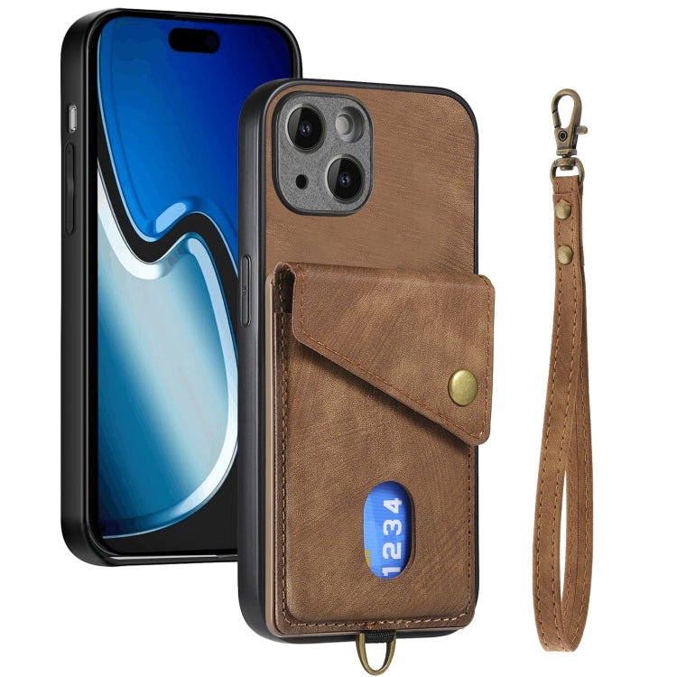 Funda Trasera para iPhone 15 Plus Retro Cross Muñequera Monedero de Cuero (Marrón)