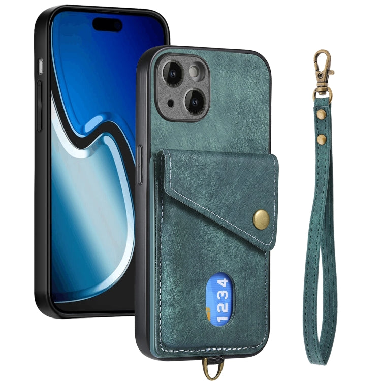 Funda Trasera para iPhone 15 Plus Retro Cross Muñequera Monedero de Cuero (Verde)