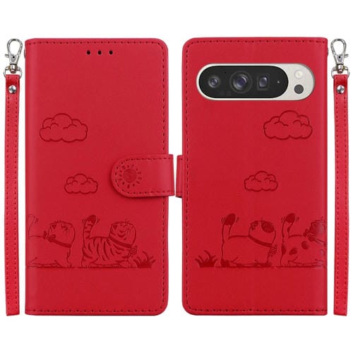 Funda de Cuero Rfid para Google Pixel 9 y 9 Pro con Diseño de Gatos (Roja)