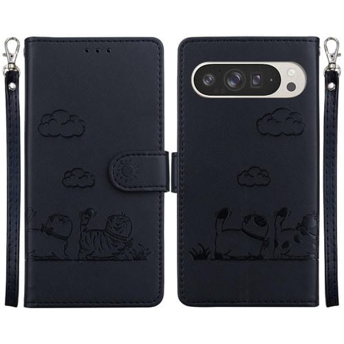 Funda de Cuero Rfid para Google Pixel 9 y 9 Pro con Diseño de Gatos (Negra)