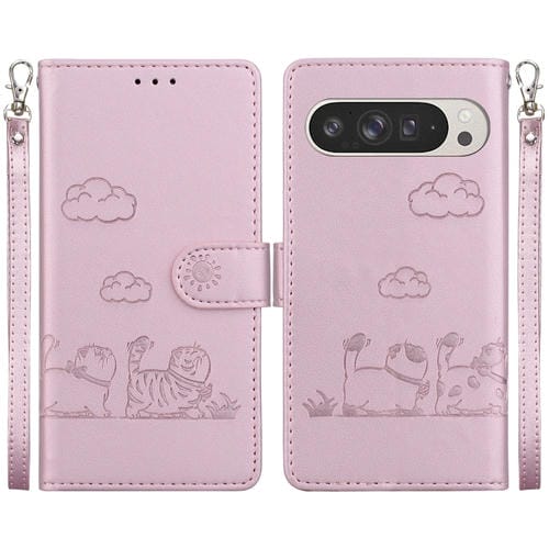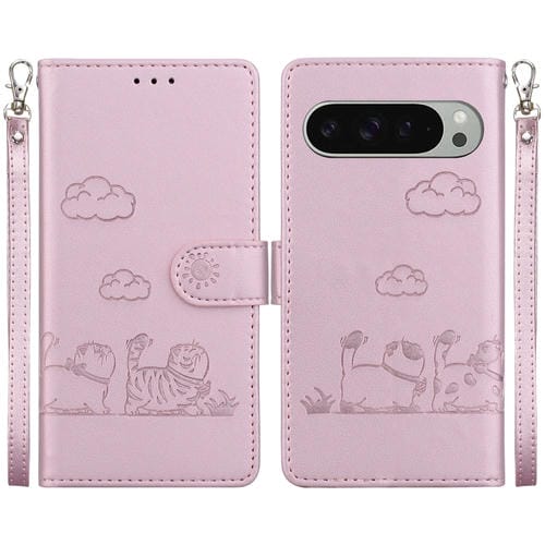 Funda de Cuero Rfid para Google Pixel 9 y 9 Pro con Diseño de Gatos (Oro Rosa)