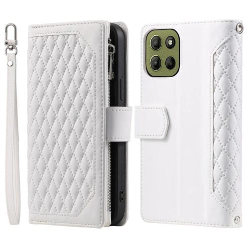 Funda de Cuero con Cremallera y Textura de Cuadrícula para Motorola Moto G15 con Cordón (Blanco)