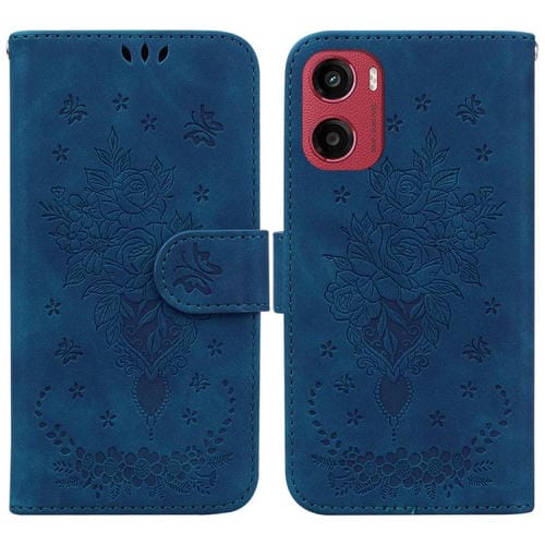Funda de Cuero con Relieve Mariposa y Rosa para Motorola Moto G05/E15 (Azul)