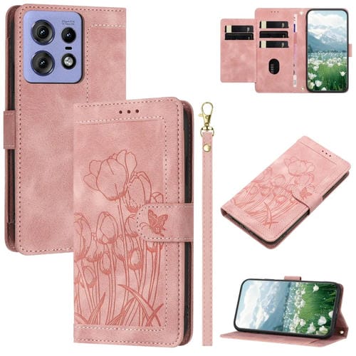 Funda de Cuero con Relieve de Tulipanes para Motorola Edge 50 Pro con Cordón (Rosa)