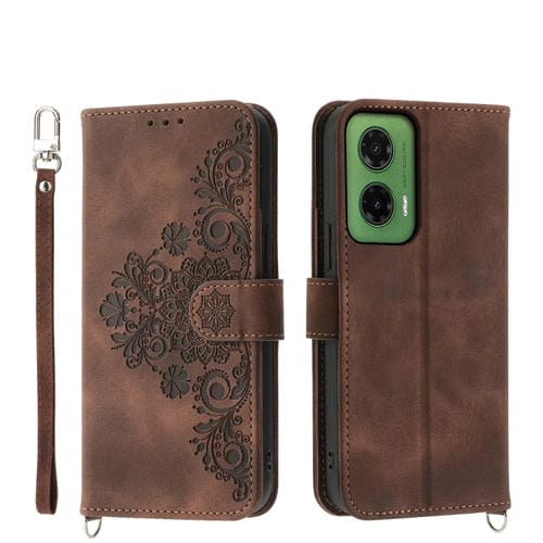 Funda de Cuero con Relieve de Flores para Motorola Moto G35 (Marrón)