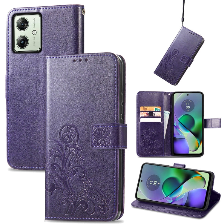 Funda para Motorola Moto G54 5G de Cuero en Relieve con Cierre de Cuatro Hojas (Púrpura)