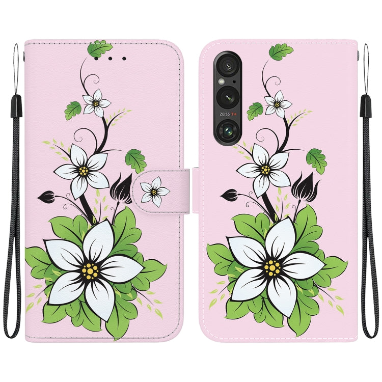Estuche de Cuero Sony Xperia 1 V (2023) con Dibujo Coloreado y Textura de Cristal (Lily)