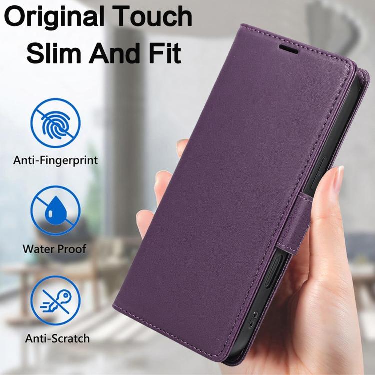 Funda de cuero antirrobo RFID con hebilla lateral para iPhone 17 Pro (morado oscuro)