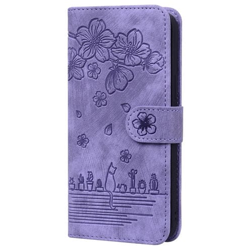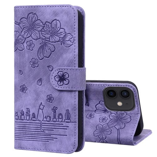 Estuche para iPhone 12 Mini Cartoon Sakura Cat Cuero En Relieve (Púrpura)