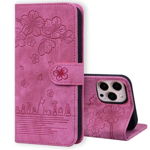 Estuche para iPhone 12 Pro Max Cartoon Sakura Cat de Cuero en Relieve (Rose Red)