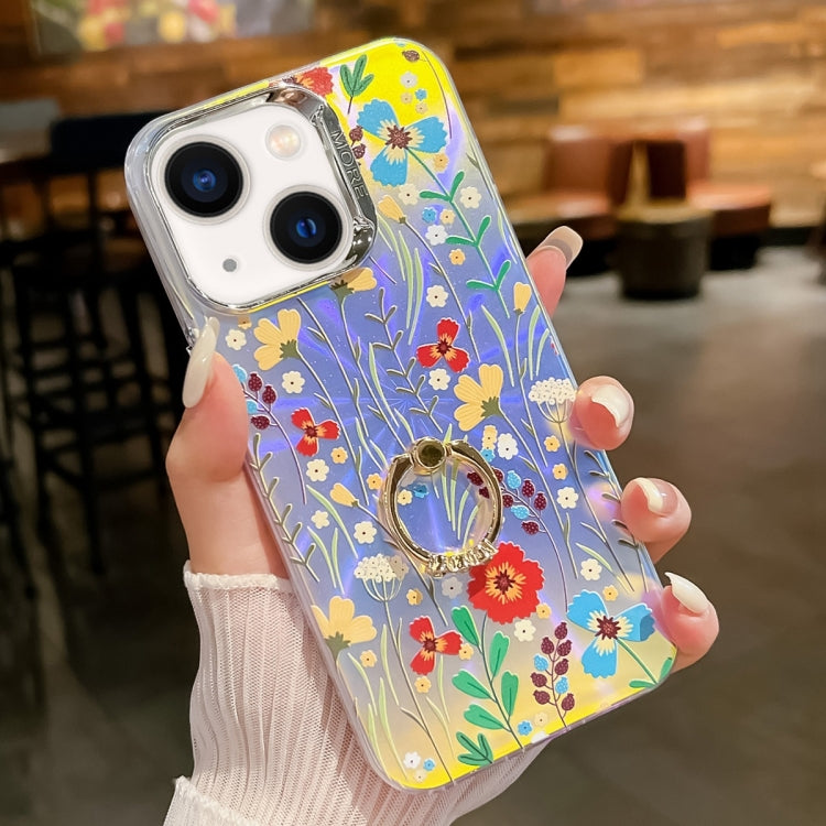 Caja de teléfono TPU para iPhone 13 con soporte de anillo flor láser galvanoplastia (Lavanda)