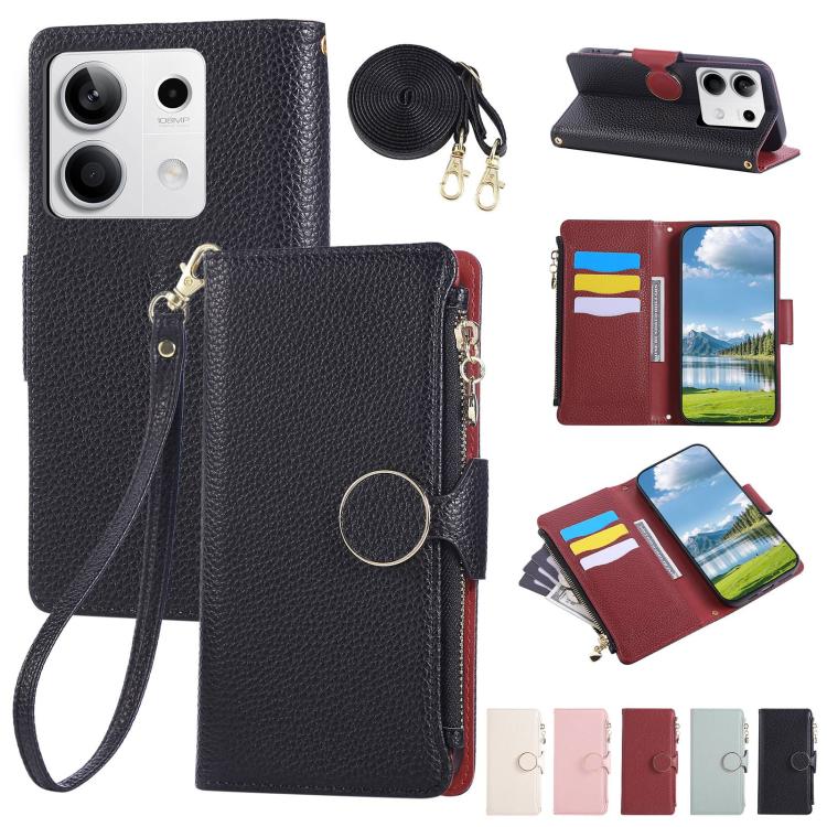 Funda de cuero con hebilla redonda y cremallera para Redmi Note 14 5G, con correa cruzada (negro)