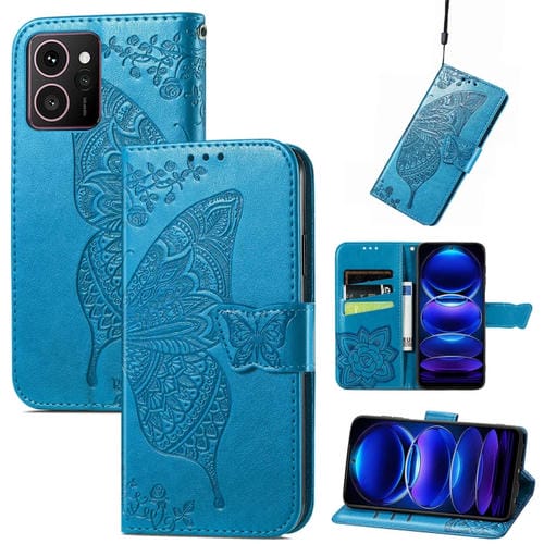 Funda de Cuero con Relieve Mariposa y Flor para Teléfono HMD Skyline (Azul)