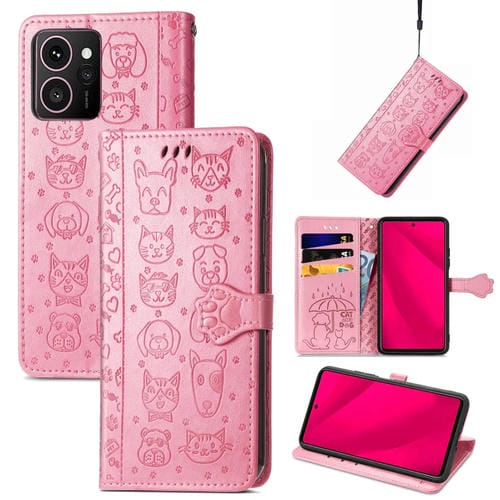 Funda de Cuero con Relieve Gato y Perro para Teléfono HMD Skyline (Rosa)