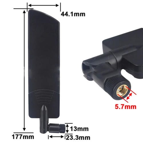 - Ganancia de 8 dBi, Potencia nominal de 50W, rango de frecuencia de 600-6000 MHz, impedancia de entrada de 50 ohmios, relación de onda estacionaria 2 dB, dimensiones de 177x44.1 mm, peso neto de 40 g, temperatura de operación de -40 a 60 °C