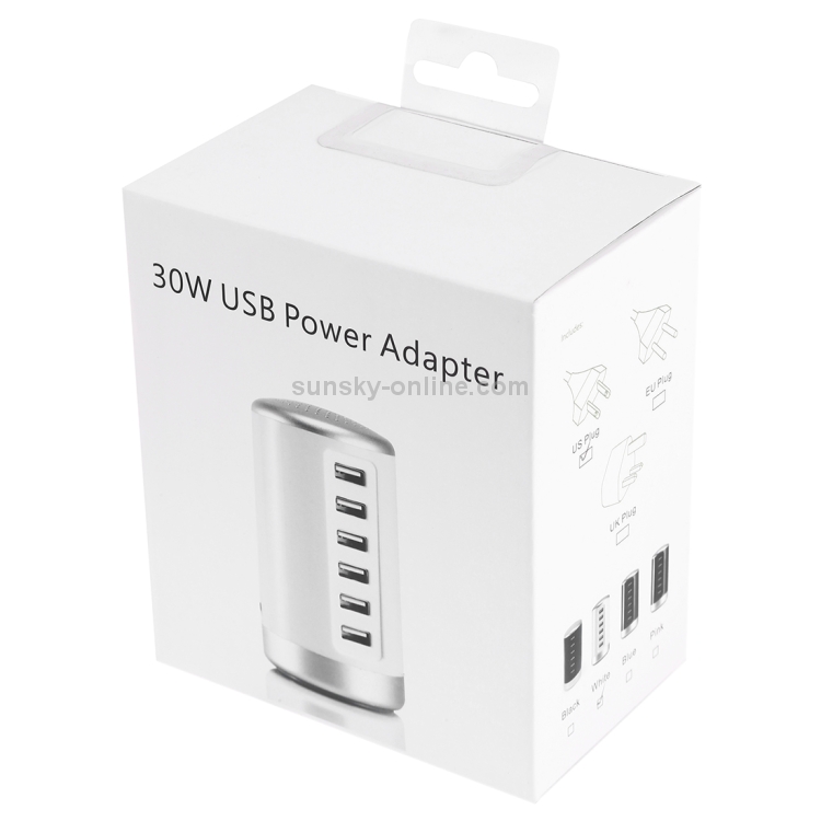 Adaptador de Corriente Estación de Cargador 30 W 6 Puertos AC100-240V Enchufe EE. UU. (Blanco)