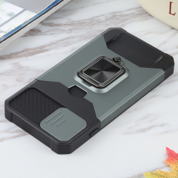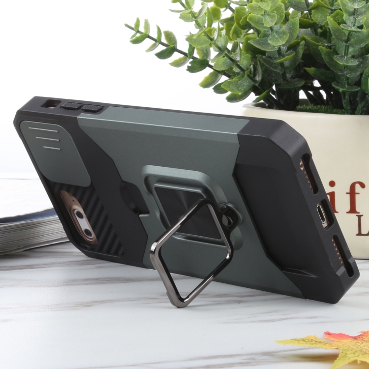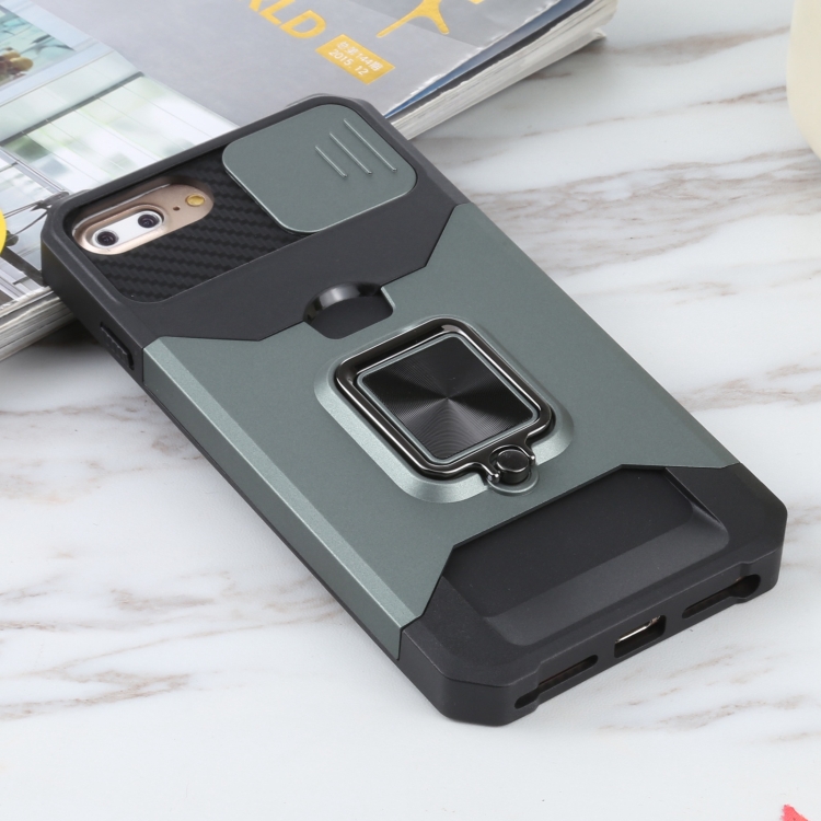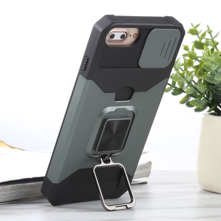 Funda para iPhone 8 Plus 7 Plus 6S Plus 6 Plus PC TPU con Caja Cámara Deslizante Soporte Anillo Ranura Tarjeta (Verde Oscuro)