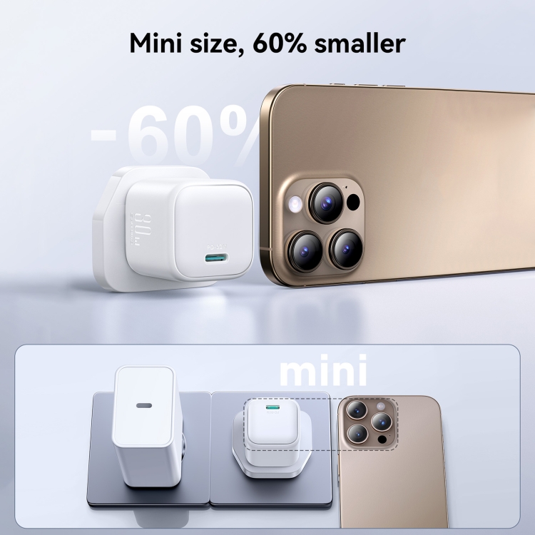 1. Mini y portátil, un 60 % más pequeño que un cargador original de 30 W