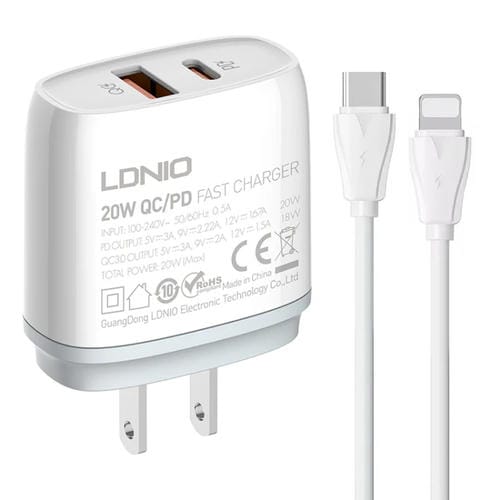 Cargador rápido USB + Tipo C Ldnio Q229 QC3.0/PD20W con cable Tipo C a 8 Pines 1 m (Blanco)