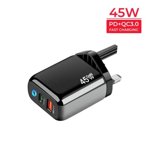 Cargador TE-PD45 GaN 45 W PD3.0/Tipo C + USB 3.0 con cable de datos tipo C a tipo C, enchufe británico (negro)