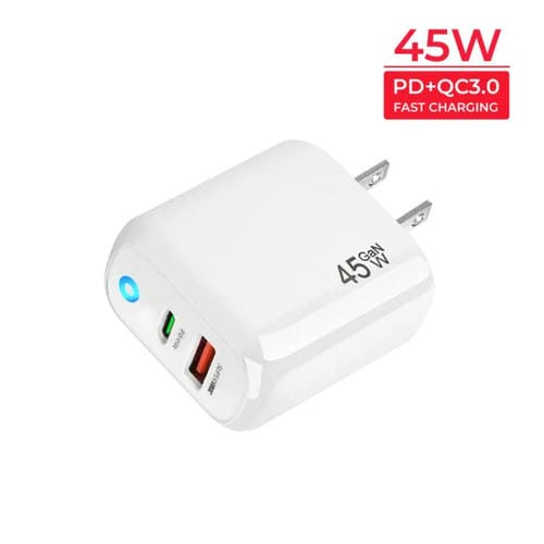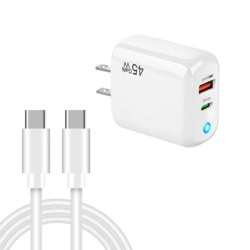 Cargador TE-PD45 GaN 45 W PD3.0/Tipo C + USB 3.0 con cable de datos tipo C a tipo C, enchufe estadounidense (blanco)