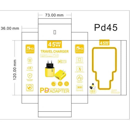 Cargador TE-PD45 GaN 45 W PD3.0/Tipo C + USB 3.0 con cable de datos tipo C a tipo C, enchufe UE (amarillo)