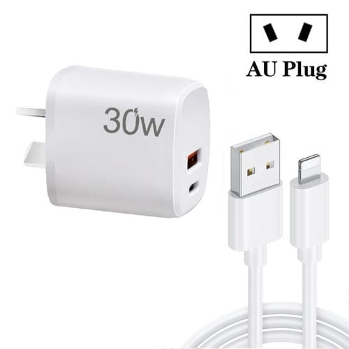 Cargador Usb Pd 30W Usb-C Type-C + Qc3.0 con Cable Usb A 8 Pines 1 m (Blanco)