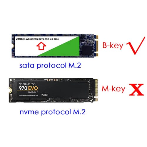 • Interfaz M.2 KEY-B SATA3.0 6Gbps; soporta SSD tamaño 2230, 2242, 2260, 2280; no compatible con SSD NVMe o PCIe; dimensiones 109 mm x 23,6 mm x 3,0 mm; temperatura operativa -30 a 70 °C