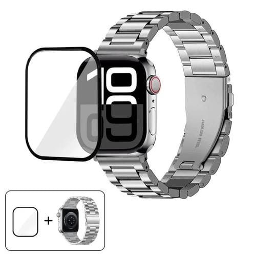 Correa de acero inoxidable con tres cuentas y película curva 3D para Apple Watch Series 10 de 42 mm (plateada)