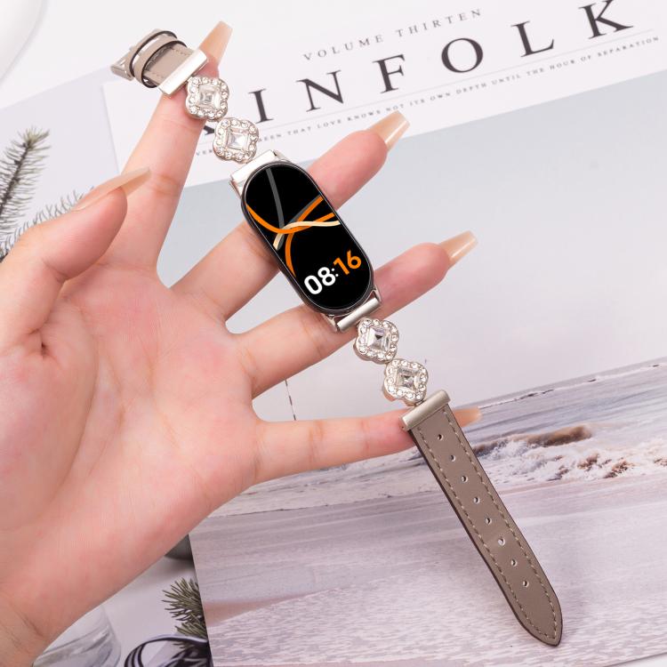 Correa de reloj de pulsera de cuero con diamantes de metal para Xiaomi Smart Band 9/8 (gris estrellado)