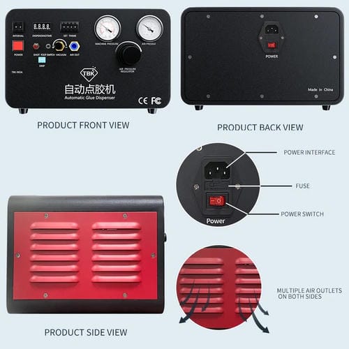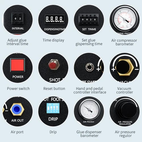 • Potencia de 300W; control por pedal; modos manual y temporizador; válvula reguladora de presión y barómetro de alta precisión; incluye 3 jeringas y 12 agujas; tamaño 290 x 220 x 175 mm; cantidad mínima de pegamento 0,01 ML; tiempo de intervalo 0,1-9,9 segundos.