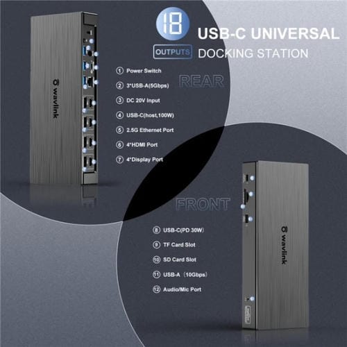 - 8 salidas HD/DP++ soportando hasta 5K (5120x1440) a 60 Hz, Carga PD host de 100 W, Puerto USB-C PD de 30 W (solo Carga), tres Puertos USB-A 5 Gbps, un Puerto USB-A 10 Gbps, Lector de Tarjetas SD/TF con velocidad máxima de 312 MB/s, Conexión Ethernet RJ45 de 2,5 Gbps, Puerto combinado de audio y Micrófono, adaptador de corriente de 180 W incluido
