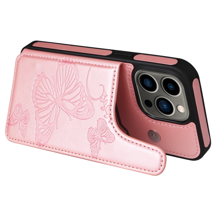 Estuche teléfono a prueba de golpes iPhone 13 Pro patrón estampado mariposa (Oro Rosa)