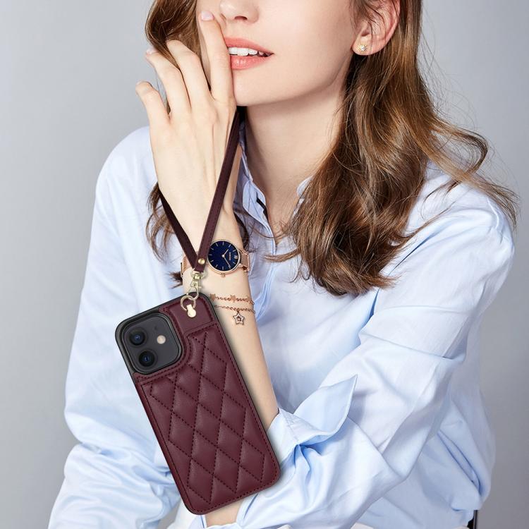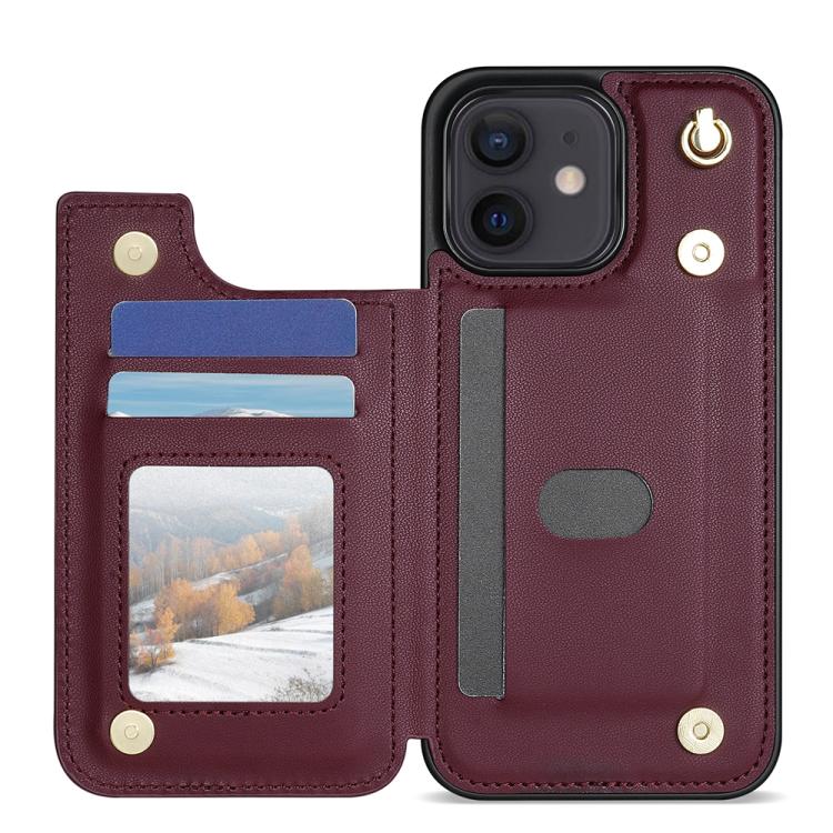 Estuche para Teléfono Rombal iPhone 11 Ranuras Tarjetas Hebilla Doble Cordón (Rojo Vino)