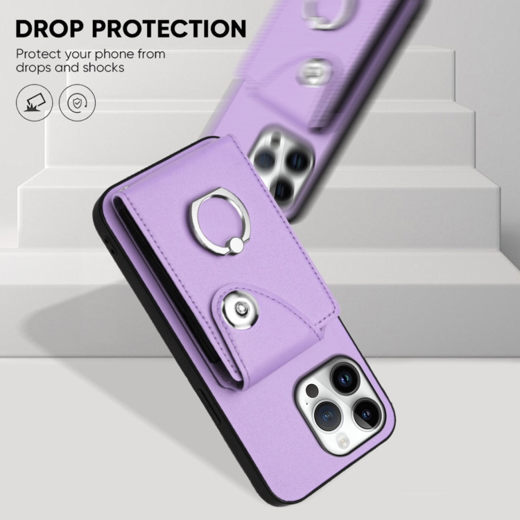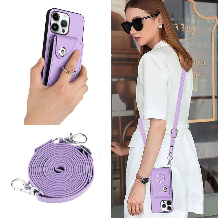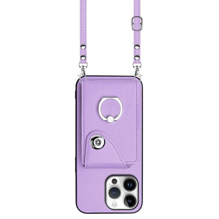 Estuche para Teléfono iPhone 16 Pro Max con Soporte para Tarjetas y Anillo con Cordón Largo (Morado)