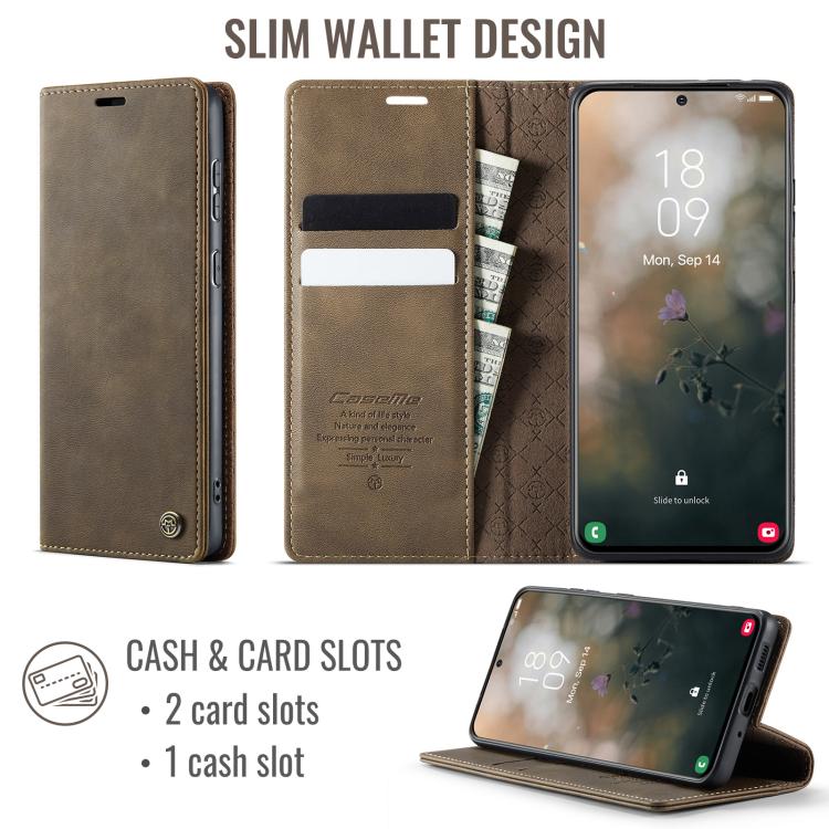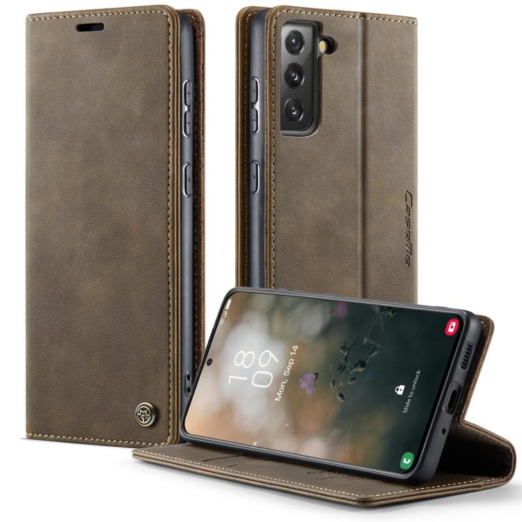 Funda CaseMe 033 para Samsung Galaxy S21 5G, forro de piel de becerro, microfibra, con bloqueo RFID (café)