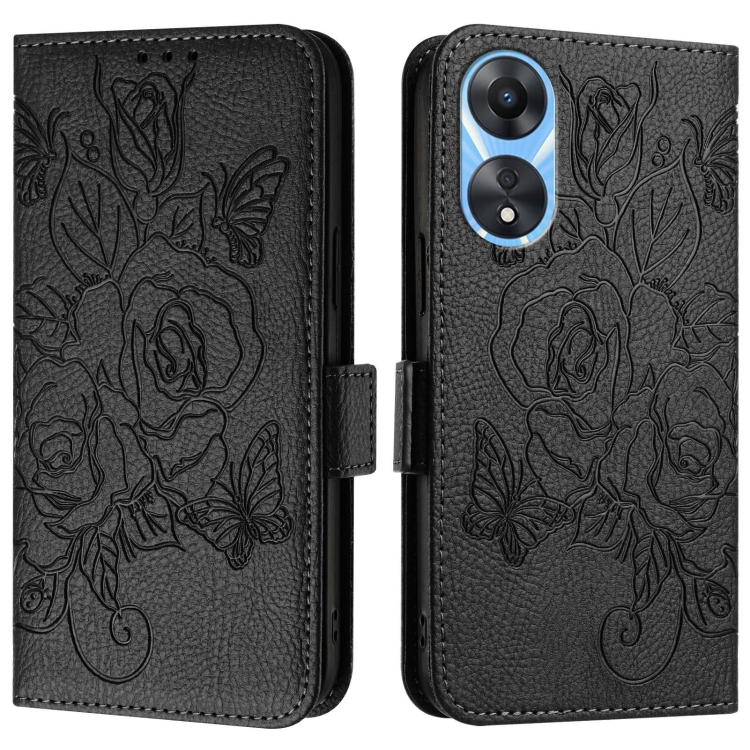 Funda de Cuero Antirrobo Rfid con Relieve En Rosa para Oppo A78 5G/A1X 5G (Negra)