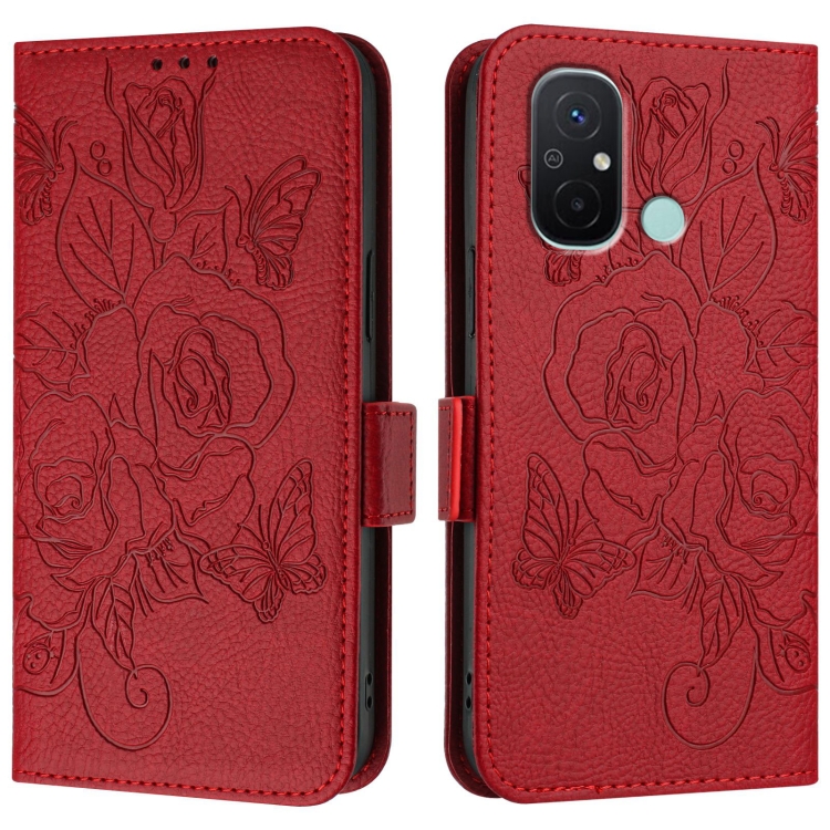 Funda de Cuero Antirrobo Rfid con Relieve En Rosa para Redmi 12C/11A (Rojo)