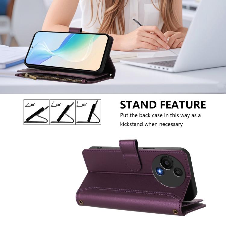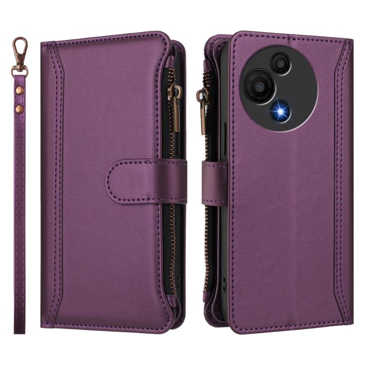 Funda de cuero con cierre magnético para TCL 605/60 SE, 9 ranuras para tarjetas, cremallera y correa de mano (morado)