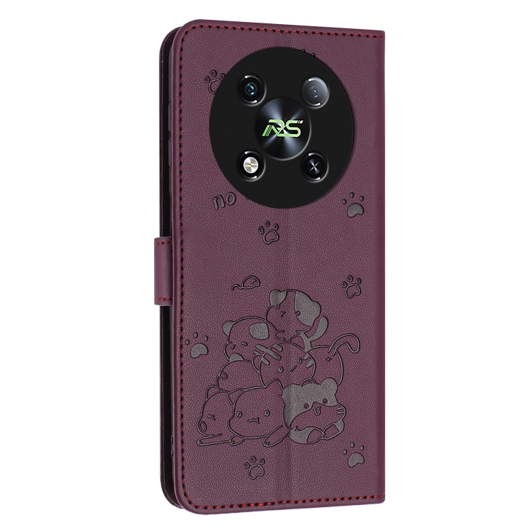 Funda de Cuero con Cordón para Teléfono Itel Rs4 con Diseño de Gatito en Relieve (Rojo Vino)