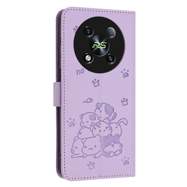 Funda de Cuero con Cordón para Teléfono Itel Rs4 con Gatito en Relieve (Morado)