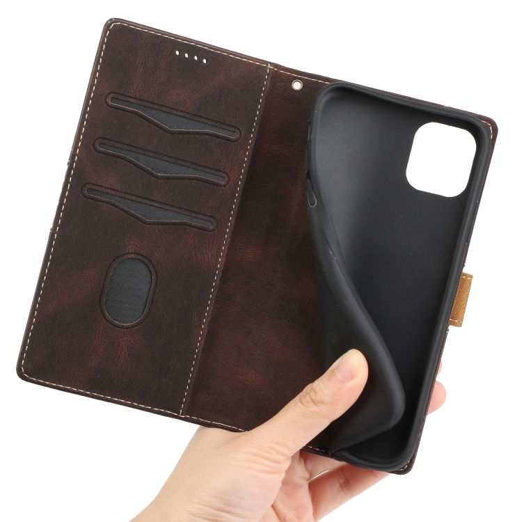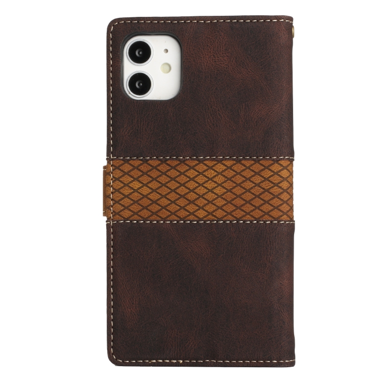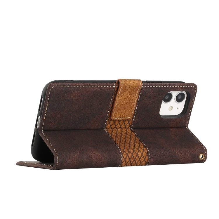 Funda de Cuero para iPhone 11 con Costuras en Cuadrícula y Cordón (Marrón)