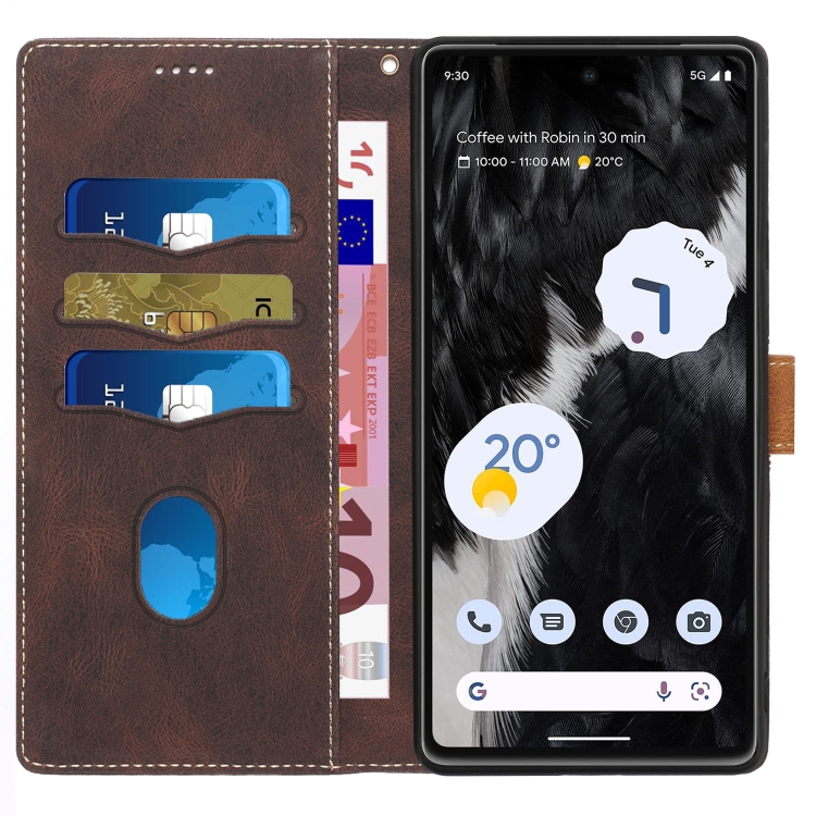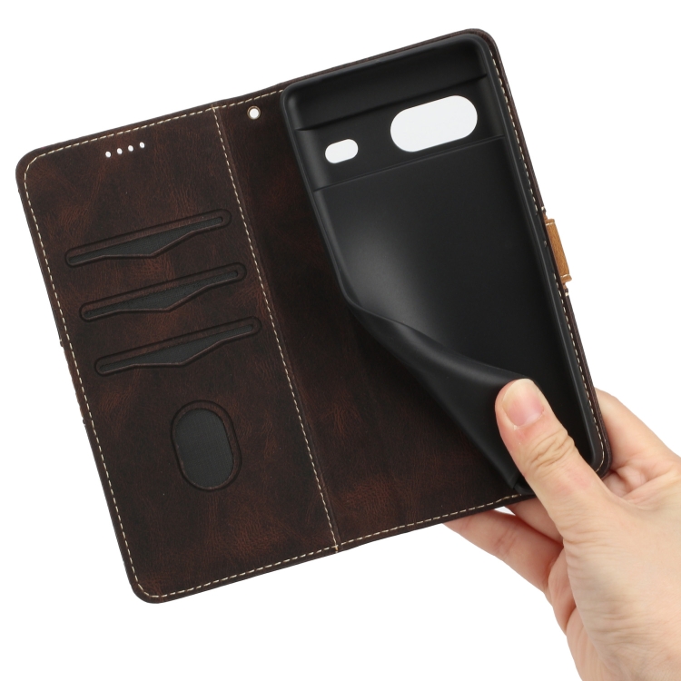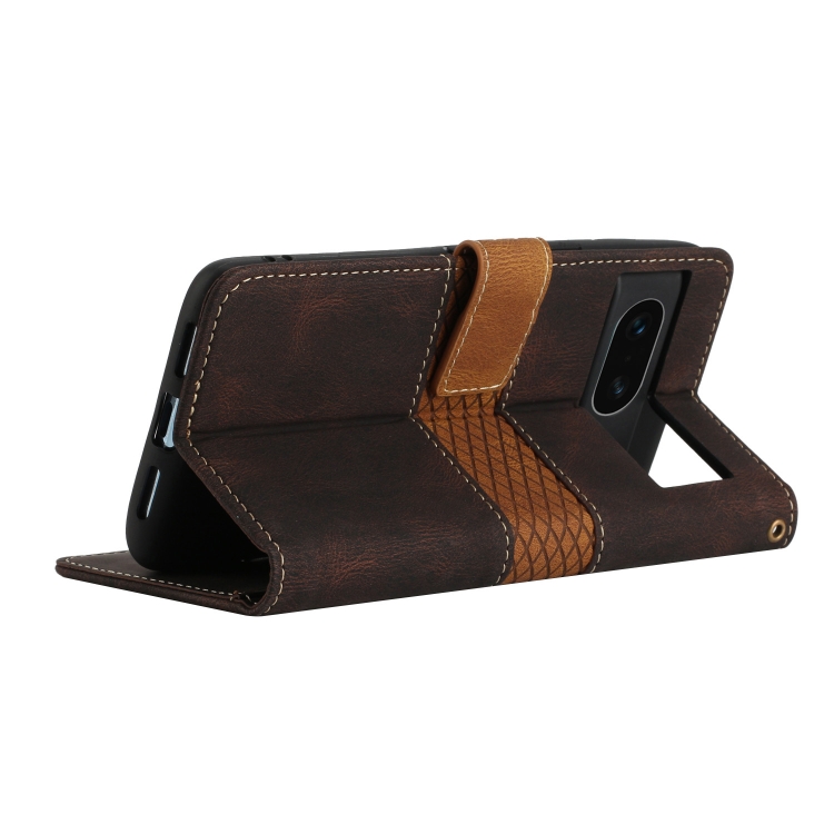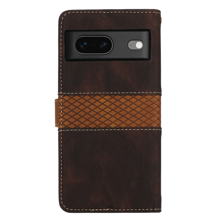 Funda de Cuero para Google Pixel 7 con Costuras en Cuadrícula y Cordón (Marrón)