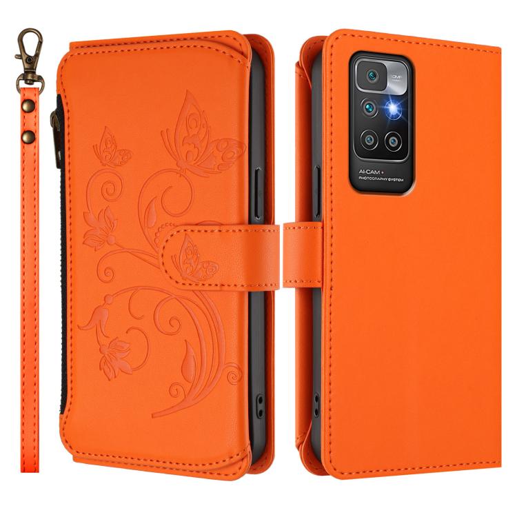 Funda de cuero con cremallera para Redmi 10 2022, diseño de mariposas, flores y mariposas (naranja)